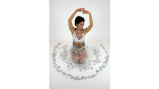 Con el tiempo, creó delicadas telas con forma de tela de araña que cubrían elegantemente el maniquí, y otras las ató a piezas de tul y tela de malla con una prensa de calor, el tipo más utilizado para transferir diseños de camisetas.