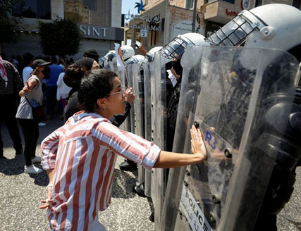 Los manifestantes se paran frente a la policía durante los enfrentamientos en una protesta tras la muerte de Nizar Banat, un crítico palestino que murió después de ser arrestado por las fuerzas de seguridad de la Autoridad Palestina. REUTERS / Mohamad Torokman