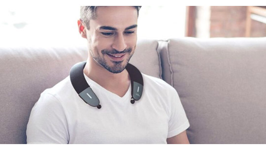 En un dispositivo que va apoyado comodamente sobre los hombros, BeHear PROXY conjuga un par de altavoces inalámbricos (con micrófono), montados comoamente sobre tu cuello.