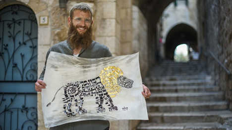 Kalman Gavriel, el escriba de Jerusalén, creó este león de Jerusalén con letras hebreas. Foto © Yaakov Margol