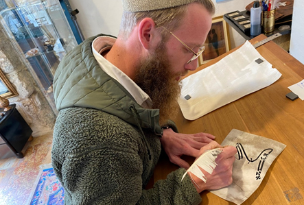Originario de Minneapolis, este escriba de 33 años crea obras de arte del alfabeto hebreo desde hace ocho años y organiza talleres de caligrafía para grupos dentro del sitio histórico de las Cuatro Sinagogas Sefardíes de la Ciudad Vieja.