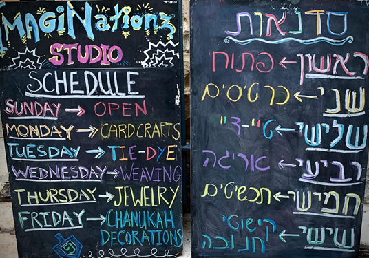 Recientemente, el estudio y galería de artes de escritura de Kalman Gavriel abrió en Jabad 58 en la parte superior de las escaleras. Allí comparte espacio con Vive la Biblia, un lugar divertido para vestirse con trajes bíblicos y tomaste una foto.
