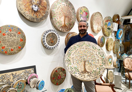 Chanan Eliav de la galería Rina con pinturas de pergamino sobre madera. Foto: Abigail Klein Leichman