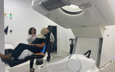 El moderno tratamiento de radiación utiliza una silla innovadora que puede mover al paciente 360 grados para apuntar con precisión a los tumores con sus rayos de alta energía.