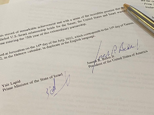 Los líderes de Estados Unidos e Israel, el presidente Biden y el primer ministro Lapid, se reunieron en Jerusalén el 14 de julio de 2022, y adoptaron la siguiente Declaración de Asociación Estratégica entre Estados Unidos e Israel: