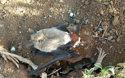 El cadáver de un gran murciélago cola de ratón en el parque eólico Ramat Sirin. Esta especie se encuentra en peligro de extinción y sufre una mortalidad especialmente elevada tanto en los parques eólicos de Sirin como en Gilboa. (Autoridad de Parques y Naturaleza de Israel)