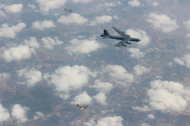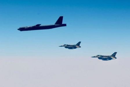 Tres aviones de combate israelíes F-16i escoltaron a dos bombarderos estratégicos subsónicos B-52 Stratofortress estadounidenses, el domingo, sobre el espacio aéreo israelí en su trayecto hacia el Golfo Pérsico.