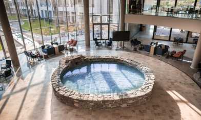 Un estanque de peces restaurado en el vestíbulo del Hotel Magdala. Foto cortesía del Centro de Turismo de Magdala