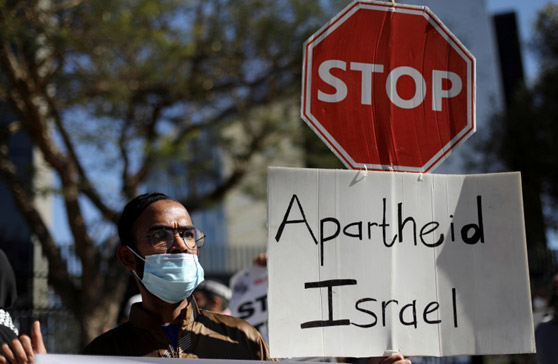 Manifestantes sudafricanos y activistas de BDS sostienen pancartas durante una protesta en mayo de 2021 frente a las oficinas comerciales de Israel en Sandton, SA, luego de un estallido de violencia israelí-palestina (Foto: SIPHIWE SIBEKO/REUTERS)