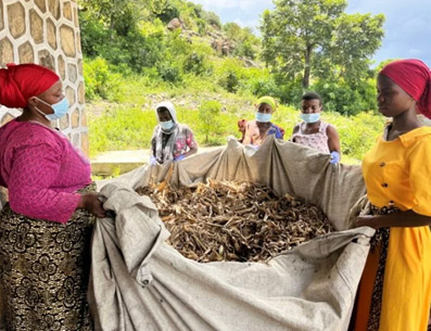 Mujeres en Tanzania con desechos agrícolas, listas para ser esterilizadas para el cultivo de hongos. Foto: cortesía