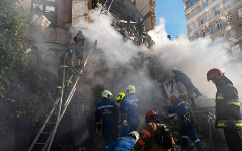 Bomberos trabajan después de que un dron atacó edificios en Kiev, Ucrania, el 17 de octubre de 2022. (Foto AP/Roman Hrytsyna)