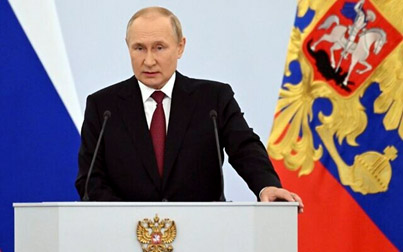 El presidente ruso, Vladimir Putin, habla durante las celebraciones que marcan la incorporación de regiones de Ucrania a Rusia en la Plaza Roja en Moscú, Rusia, el viernes 30 de septiembre de 2022. (Grigory Sysoyev, Sputnik, Kremlin Pool Photo vía AP)