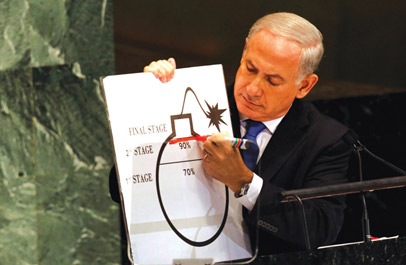 Hablando en la Asamblea General de la ONU en 2012, el entonces primer ministro Benjamin Netanyahu dibuja una línea roja en una ilustración que muestra la capacidad de Irán para crear un arma nuclear. (Foto: KEITH BEDFORD/REUTERS)