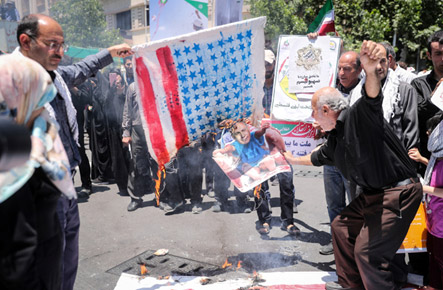 Iraníes queman un paño a semejanza de la bandera de los EE. UU. y una imagen del primer ministro de Israel, Benjamin Netanyahu, durante una protesta que marca el Día anual de al-Quds (Día de Jerusalén) el último viernes del mes sagrado del Ramadán en Teherán, Irán, el 8 de junio. , 2018. (Foto: AGENCIA DE NOTICIAS TASNIM/REUTERS)