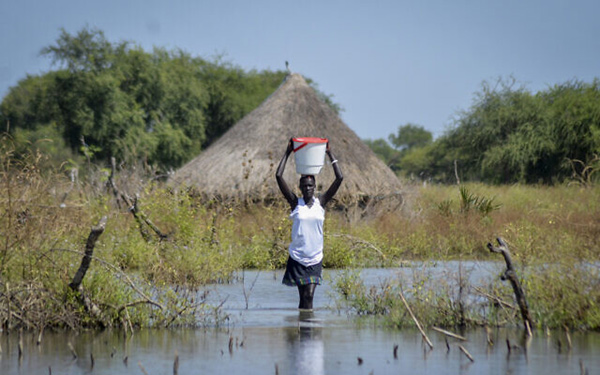 ARCHIVO – Una mujer lleva un balde en la cabeza mientras camina en aguas de una inundación en la aldea de Wang Chot, condado de Old Fangak, estado de Jonglei, Sudán del Sur, el 26 de noviembre de 2020 (Foto AP/Maura Ajak, archivo)