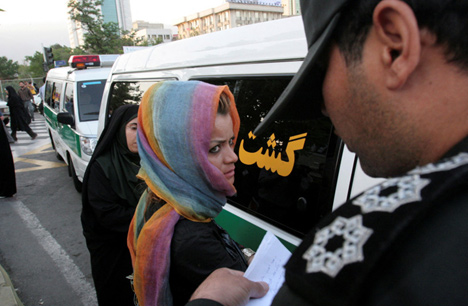 La policía de la moralidad toma nota del nombre de una mujer detenida durante una ofensiva contra la «corrupción social» en el norte de Teherán, el 18 de junio de 2008. (Foto: REUTERS/STRINGER/FOTO DE ARCHIVO)