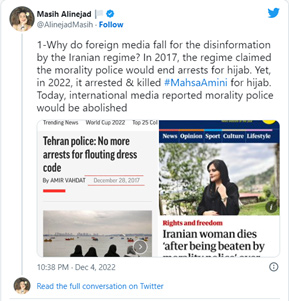 ¿Por qué la prensa extranjera cae en la desinformación del régimen iraní? En 2017, el régimen anunció que la policía de la moralidad ya no detendría a nadie por el hiyab. Sin embargo, en 2022, arrestó y asesinó a Mahsa Amini por el hiyab. Hoy la prensa extranjera reporta que la policía de la moralidad sería eliminada.