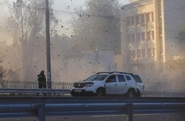 Escombros vuelan durante un ataque con drones rusos, con lo que las autoridades locales dijeron que eran vehículos aéreos no tripulados Shahed-136 de fabricación iraní, en Kiev, Ucrania, el 17 de octubre. (Foto: Roman Petushkov/Reuters)