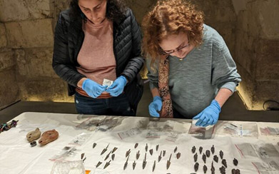 Jessica Lewinsky (izquierda), conservadora, y Ravit Ninner-Soriano, curadora de la Torre de David, empacan las puntas de flecha para prepararlas para su instalación en su vitrina permanente el 13 de diciembre de 2022 en Jerusalén. (Melanie Lidman/Tiempos de Israel)