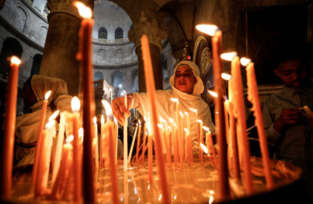 Una fiel cristiana enciende velas mientras asiste a la Misa del Domingo de Pascua en la Iglesia del Santo Sepulcro en la Ciudad Vieja de Jerusalén el 17 de abril de 2021. (Foto: AMIR COHEN/REUTERS)