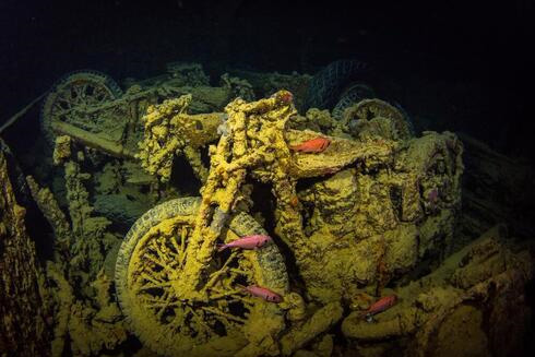 Un pez nada cerca de uno de los restos de la motocicleta en los restos del naufragio del barco británico SS Thistlegorm. (Ynet)