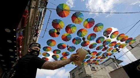 Un trabajador palestino con una máscara en el sur de la Franja de Gaza rocía agua afuera de las tiendas decoradas para el Ramadán. (Reuters)