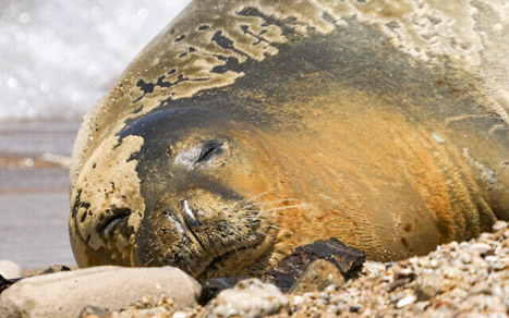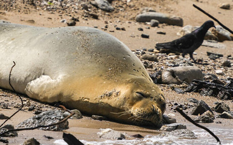 Yulia, una foca monje del Mediterráneo en peligro de extinción, descansa en la playa de Tel Aviv, mayo de 2023. (Yehiel Lamesh)