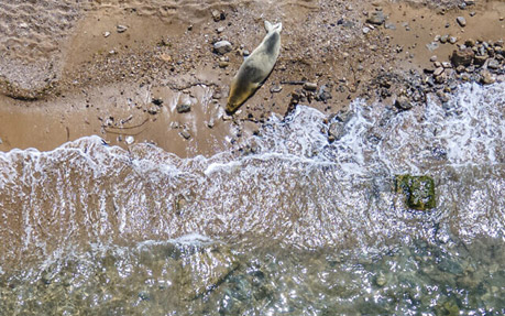 Una vista aerea de Yulia, una foca monje del Mediterráneo en peligro de extinción que descansa en la costa de Tel Aviv, el martes 16 de mayo de 2023. (AP/Ariel Schalit)