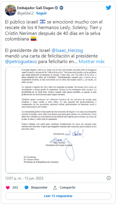 Por su parte, el embajador de Israel en Colombia, Gali Dagan, también se refirió en un tweet a la carta que envió el presidente de Israel: