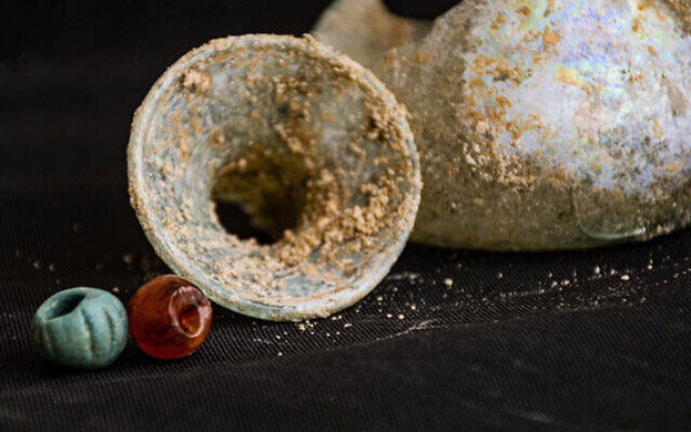 Un recipiente de vidrio y cuentas de vidrio descubiertos en una cueva funeraria de 1800 años de antigüedad en el norte de Israel que casi fue destruida por la construcción en mayo de 2023. (Cortesía de Yoli Schwartz/IAA)