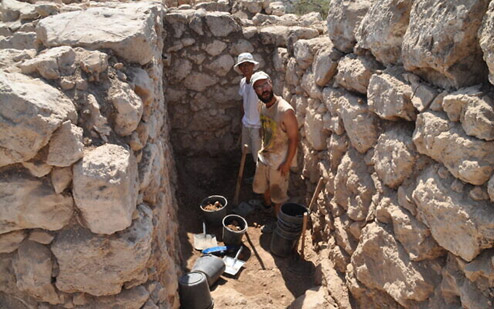 Un primer plano de una de las casamatas en la muralla de la ciudad de Khirbet Qeiyafa durante las excavaciones en 2007-2013. (cortesía de Yosef Garfinkel)