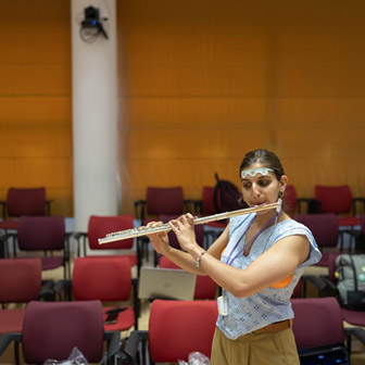 Una flautista conectada para un análisis de EEG durante una demostración de Maimon en la Universidad de Tel Aviv. Foto: Tomer Appelbaum