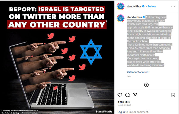 Un nuevo e inquietante estudio ha revelado que Israel, el único Estado judío, es objeto aproximadamente de 10 veces más ataques que cualquier otro país en Tweets relacionados con violaciones de los derechos humanos, lo que contribuye a la continua distorsión de Israel en la esfera pública.