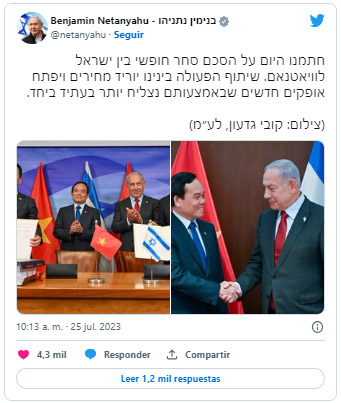 Por otro lado, Netanyahu y Quang sostuvieron una reunión en la que discutieron el fortalecimiento de la cooperación bilateral en innovación, agricultura y turismo, y evaluaron la posibilidad de vuelos directos entre Israel y Vietnam.