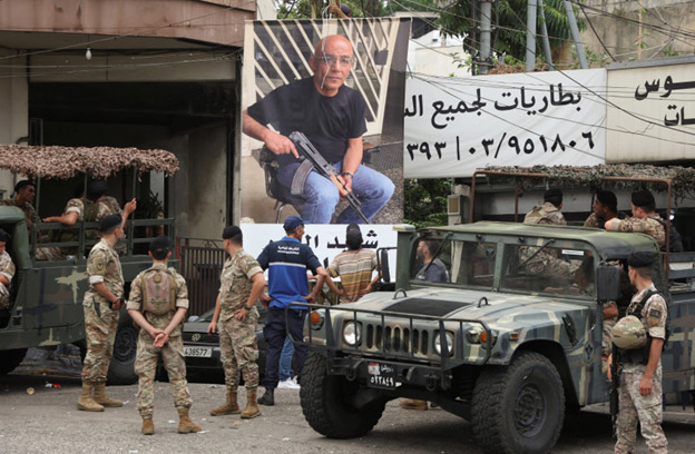 Miembros del ejército libanés cerca de un afiche de Fadi Bejjani, quien murió durante un intercambio de disparos en el área donde se volcó un camión la noche anterior, en la ciudad de Kahaleh, Líbano, el 10 de agosto de 2023. (Foto: MOHAMED AZAKIR/REUTERS).