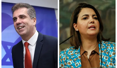 El ministro de Asuntos Exteriores israelí, Eli Cohen, y su homóloga libia, Najla Mangoush. Foto: Ohad Zwigenberg, AP
