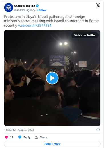 El informe de la BBC afirmó además que el jefe del parlamento de Libia acusó a Mangoush de traición y convocó a una reunión parlamentaria de emergencia. El consejo presidencial de Libia dijo que la reunión entre los dos ministros «de ninguna manera refleja la política exterior del Estado libio» y que es una «violación de la ley de Libia que considera la normalización con la ‘entidad sionista’ un delito penal».