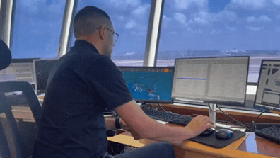 Los trabajadores de la torre de control se apresuran a trasladar los aviones a diversos puntos de la zona operativa del aeropuerto. Abajo, bajo el sol, decenas de personas trabajan en la carga y descarga de equipajes.