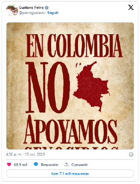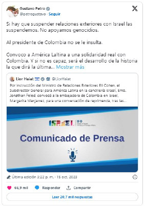 Israel condena las declaraciones del presidente que reflejan un apoyo a las atrocidades cometidas por los terroristas del Hamás, avivan el antisemitismo y afectan a los representantes del Estado de Israel y amenazan la paz de la comunidad judía en Colombia.