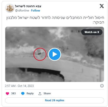 Hacer clic en el link para ver el video: https://twitter.com/idfonline/status/1713101827598594456?ref_src=twsrc%5Etfw%7Ctwcamp%5Etweetembed%7Ctwterm%5E1713101827598594456%7Ctwgr%5Ed6aa0f0056738a18f59df69e026ee84ff9dbe59f%7Ctwcon%5Es1_&ref_url=https%3A%2F%2Fwww.timesofisrael.com%2Fidf-again-strikes-hezbollah-after-drones-from-lebanon-intercepted-over-north%2F