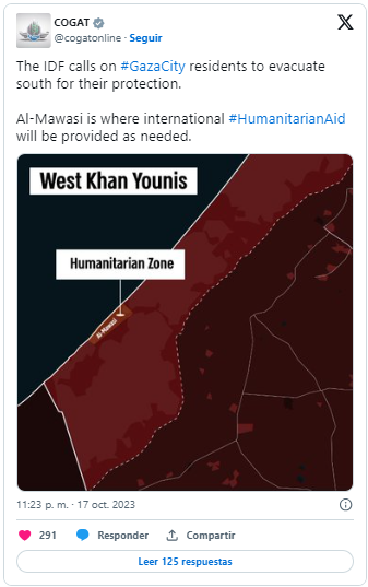 También renovó los llamados a los palestinos del norte de la Franja de Gaza para que evacuen la zona hacia el sur del enclave costero. Las FDI han advertido que pronto se llevarán a cabo intensos ataques en el área.