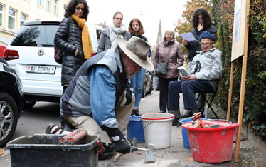 Una piedra conmemorativa está colocada en el suelo frente a la casa donde vivió el padre de Shoshan Haran en Stuttgart antes de huir de Alemania con sus padres a los 7 años en 1933. (Aviv Havron)