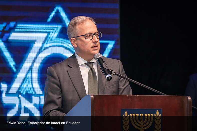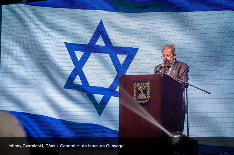 El señor Johnny Czarninski, Cónsul General H. de Israel en Guayaquil y el señor Edwin Yabo, Embajador de Israel en Ecuador, se dirigieron a los invitados con emotivos discursos que resaltaron la gran hazaña del Estado de Israel al enfrentarse a sus enemigos en sus inicios como nación y prevalecer en contra de todo pronóstico..